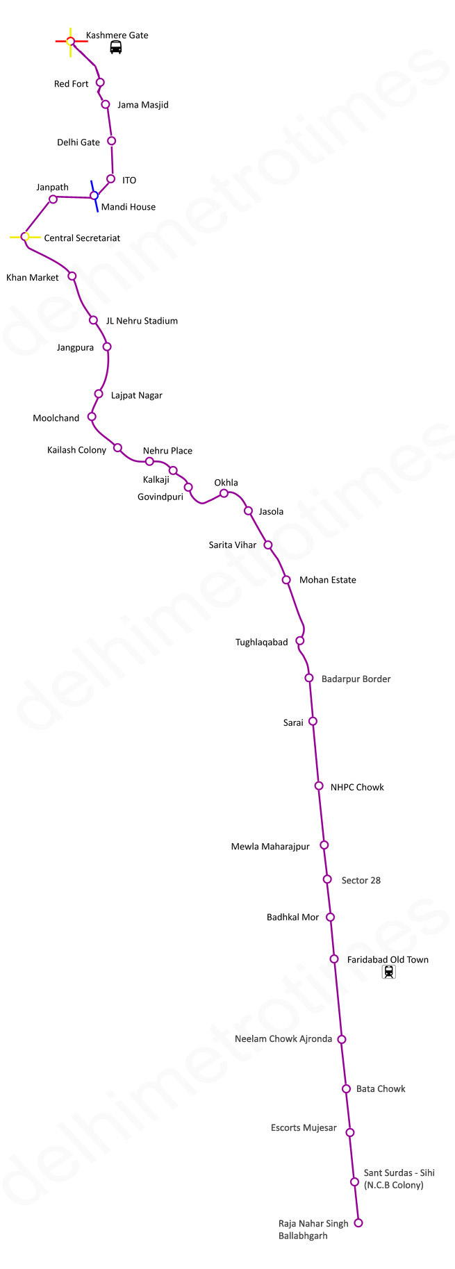 दोस्तों, अगर आप फरीदाबाद या कश्मीरी गेट के माध्यम से दिल्ली में यात्रा करना चाहते हैं, तो आपके पास बहुत सारे विकल्प हैं, जैसे कि आप स्थानीय ट्रेन या DTC बस में सवार हो सकते हैं। और अगर आप प्रदूषण मुक्त परिवहन का आनंद लेना चाहते हैं और रश में फंसना नहीं चाहते, तो आप दिल्ली मेट्रो की वायलेट लाइन का उपयोग कर सकते हैं। दिल्ली मेट्रो वायलेट लाइन (बदरपुर मेट्रो लाइन) या लाइन 6, 34 मेट्रो स्टेशन से गुजरता है, जो बदरपुर से राजा नहर सिंह (बल्लभगढ़) के माध्यम से वायलेट लाइन के मध्य सचिवालय तक जाता है। इस पूरी लाइन की लंबाई 43.2 किमी है। वायलेट लाइन दिल्ली मेट्रो की छह लाइनों में से एक है।